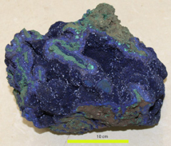 M264 蓝铜矿/孔雀石 蓝铜矿是一种碱性铜碳酸盐矿物,也叫石青。它常与孔雀石一起产于铜矿床的氧化带中。蓝铜矿可作为铜矿石来提炼铜,也用作蓝颜料,质优的还可制作成工艺品。它还是寻找铜矿的标志矿物。蓝铜矿为柱状、厚板状、粒状、钟乳状、土状等。深蓝色有玻璃光泽。