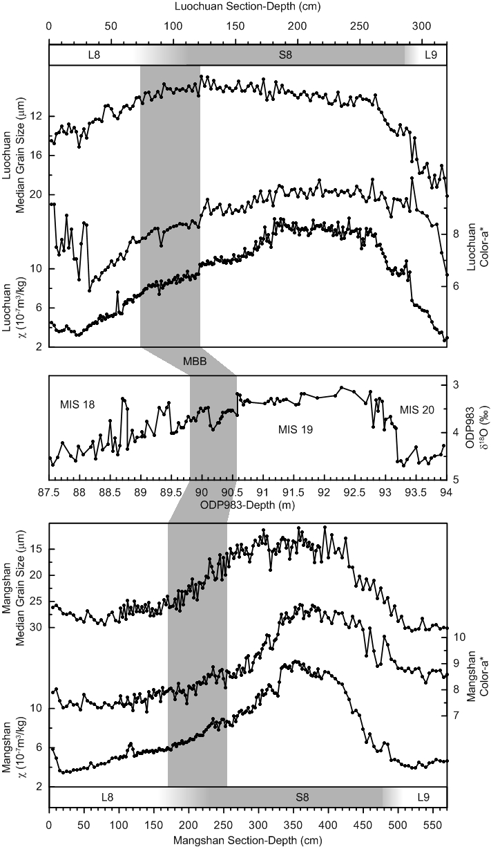 800彩票地球深部结构与过程研究室博士后靳春胜与合作导师刘青松研究员对此开展了相关研究,利用前期工作的统计方法,对河南郑州附近的邙山剖面的L8+S8(第8层黄土和之下的古土壤)进行了五套平行样品的测试,尽可能精确地界定了MB倒转带的厚度。通过邙山和洛川剖面L8+S8的气候学参数对比,结合野外地层划分,充分表明这两个剖面的MB倒转带均位于L8和S8的过渡地带,具有很好的一致性。空间上(黄土高原东南缘和腹地)的对比表明MB倒转带并非单纯地位于L8或S8,而是一部分属于S8,一部分属于L8。这个结论较好地解释了MB界线所处地层位置不确定这一现象,即前人报道的MB界线有时位于L8中下部,有时位于S8顶部。他们认为一方面是采样分辨率的问题,导致没有准确、全面地识别出MB倒转带(前人采样间距>20 cm,本次研究中为2.5 cm),另一方面是L8、S8成土地层和气候地层的划分标准问题。本项研究界定了MB的精确地层位置,进一步表明应该将L8和S8分别对应于MIS18、19。