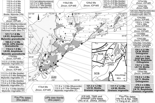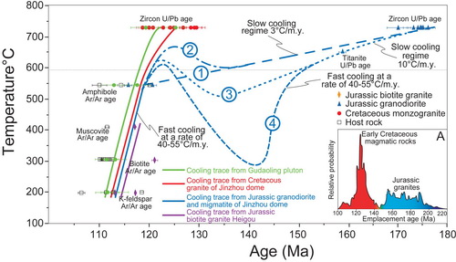 图2:辽南变质核杂岩的核部岩石和同构造花岗岩冷却史图解
