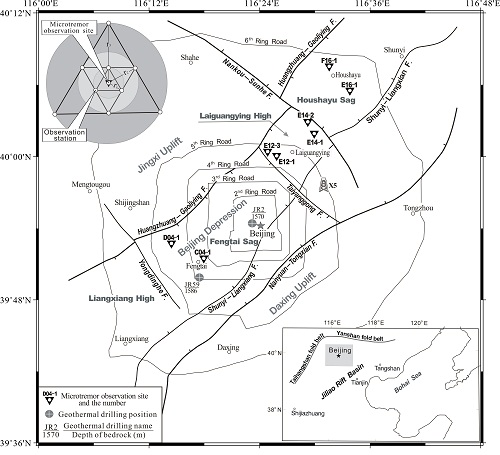 图中:倒三角示意微动台阵(测点)位置;粗实线为主要断裂;SPAC法三重圆形观测台阵示于左上角