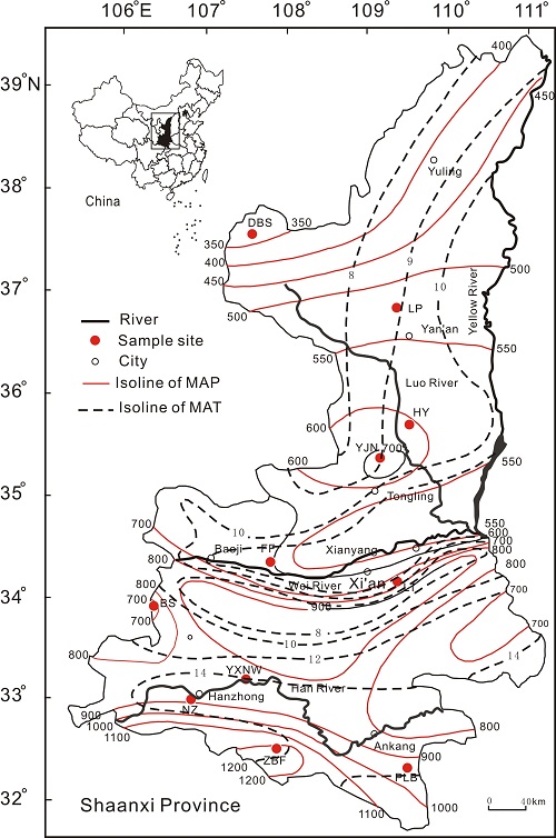 800彩票特提斯研究中心博士研究生刘志锋和导师刘青松研究员,系统研究了沿着陕西降水梯度带上(300~1300mm)分布的一系列土壤剖面(图1)的磁学性质,使用频率磁化率(cFD)和等温剩磁的硬磁组分(HIRM)分别指示土壤中亚铁磁性矿物(磁铁矿)和反铁磁性矿物(赤铁矿)含量,结果表明:(1)土壤剖面cFD和HIRM线性相关,且拟合斜率(cFD/HIRM )与年平均降水量MAP密切相关,受母质、地形和温度变化影响较小;当MAP小于1000mm时,使用cFD/HIRM建立的古降水转换函数:χFD/HIRM = 0.1244×MAP – 31.6(R2 = 0.92,预测误差70 mm)(图2),该转换函数对东亚中纬度地区的古降水重建具有重要意义;(2)降水小于1000mm时,土壤中同时生成成土磁铁矿和赤铁矿,但前者生成的速率比后者快,而降雨量大于1000mm时,溶解作用发生,赤铁矿比磁铁矿难溶解,故χFD/HIRM随降水量先升高后降低,转折点为1000mm左右;(3)χFD/HIRM值为0时,MAP为250 mm,指示当年均降水低于这个值基本没有成土矿物生成,因而该古降水转换函数的理想工作区间为250-1000mm。