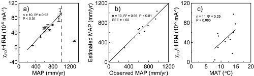 图2 a)χFD/HIRM与年均降水(MAP)关系:χFD/HIRM = 0.1244×MAP–31.6,MAP < 1000mm;b)估计MAP与真实MAP之间相关图;c)χFD/HIRM与年均温度(MAT)之间的相关图