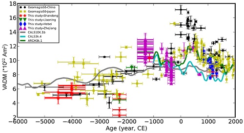800彩票特提斯研究中心博士生蔡书慧和导师朱日祥院士等人对采自山东、辽宁、浙江、河北等地的、时代涵盖近8ka的考古样品(包括陶片、瓷片、砖、烧土、窑具等,见图1)进行了详细的地磁场古强度研究。结果显示东亚地区近8ka地磁强度存在很大波动(图2):~2250 BCE存在一个极低值(~2×1022 Am2);~2250-~1300 BCE之间地磁场强度迅速升高[~(2-13)×1022 Am2];已发表数据记录到~200 CE地磁场强度存在一个极高值(spike)。地磁场强度的较大波动反映近8ka地球内部动力机制可能不稳定,地球液态外核流体运动状态可能发生很大变化。