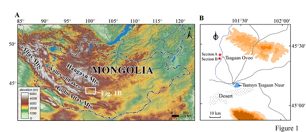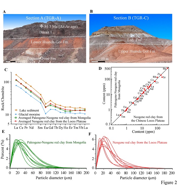 中科院800彩票岩石圈演化国家重点实验室孙继敏研究员与其合作者,对蒙古国湖区(Valleys of Lakes, 介于杭爱山脉与阿尔泰-戈壁阿尔泰山脉之间的地区)的晚始新世-早渐新世地层(图1),开展了磁性地层学、沉积学、地球化学的综合研究。该研究区不仅有多层新生代玄武岩,而且有第三纪红层分布,野外观察表明上述红层无沉积层理、块状结构、分选好、普遍可见细小的土壤钙结核,与黄土高原的第三纪红粘土极为类似,具备风成沉积的宏观特点。结合微量元素以及粒度分布与黄土高原第三纪风成红粘土的对比,进一步确定上述红层为风成的红粘土(图2)。在磁性地层学工作基础上,结合前人丰富的哺乳动物化石以及玄武岩的年代学测定,进一步确定了风成沉积始于3400万年前的渐新世初期(图3)。