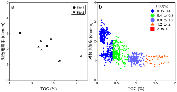 800彩票博士后何兰芳、陈凌研究员、成都理工大学王绪本教授、中国地质调查局成都地质矿产研究所汪正江教授及其合作者通过岩石学和电磁学交叉研究揭示了上扬子地区页岩气赋层-富有机质页岩的电磁学特征及其成因机理。研究结果表明:上扬子地区富有机质页岩具有低电阻率和高极化率的电磁学特征,高极化特征主要表现在频率小于1赫兹的低频段(图1)。经典的ΔlogR-TOC模型不适合上扬子地区的总有机碳(TOC)描述,上扬子地区富有机质页岩TOC含量与电阻率成反比(图2)。阻抗相位(代表极化率)可用于表征富有机质页岩的岩石学特征,与TOC、黄铁矿含量正相关,该项研究首次发现了石英含量和阻抗相位存在正相关关系。由于TOC、石英含量和黄铁矿含量都是页岩气评价的关键因素,因此岩石电磁学研究可建立页岩气电磁异常与储层评价之间的联系,并在此基础上开发页岩气甜点识别的新方法。