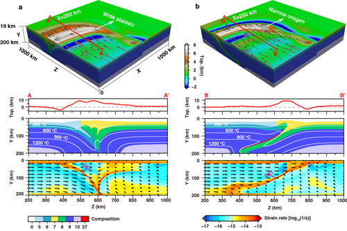 针对上述科学问题,800彩票岩石圈演化国家重点实验室的陈林副研究员与澳大利亚Monash大学的Fabio Capitanio博士、美国UIUC的Lijun Liu博士以及ETH的Taras Gerya教授,合作开展了三维热-力学模拟研究。作者设计了三组模型:(1)在第一组模型中,上板块的下地壳流变性质用“基性麻粒岩”(Wang et al., 2012)来表征,代表强度弱的亚洲岩石圈(图2a);(2)在第二组模型中,上板块的下地壳流变性质用“辉绿岩”(Mackwell et al., 1998)来表征,代表强度大的亚洲岩石圈(图2b);(3)在第三组模型中,上板块的下地壳由两部分组成,左部分(0~200 km)的下地壳用“辉绿岩”来表征,右部分(200~1000 km)的下地壳用“基性麻粒岩”来表征(图3)。下板块的下地壳流变性质均由“斜长石”(Ranalli, 1995)来描述。模拟结果显示:弱的亚洲地壳有利于应变向北传递,最终在碰撞带的后方形成一个宽阔的造山高原(图2a);相比之下,强的亚洲地壳抑制了高原的形成,造山吸收了大部分会聚量,同时强的亚洲岩石圈下插到印度岩石圈下方,形成了一个反极性的俯冲(图2b)。当将二者合并到同一个模型中时,在模型左部(即西部)形成了一个窄的造山带,同时上板块向南下插到造山带之下,形成了反极性的俯冲;而在模型右部(即东部)形成了宽广的造山高原,下板块俯冲到高原之下(图3)。将模拟结果与印度-亚洲碰撞带的主要特征进行对比(图1),作者认为亚洲大陆地壳的强度非均一性控制了青藏高原岩石圈变形及其结构的东西向变化。