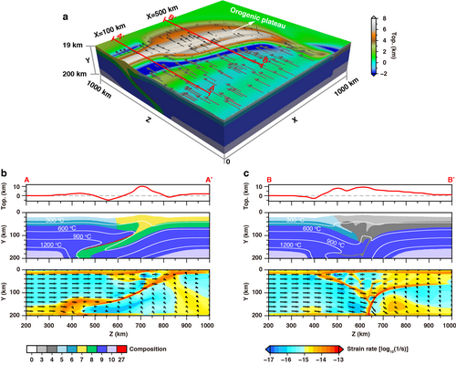 图3 综合模型的模拟结果。上板块左部分(0≤Z≤200 km)的下地壳由 “辉绿岩”组成,右部分(200≤Z≤1000 km)由 “基性麻粒岩”组成