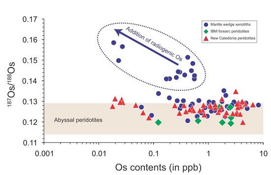 俯冲带是地壳物质循环以及壳幔物质交换的重要场所。俯冲板片发生脱水或熔融所释放出的流体或熔体交代并引发上覆地幔楔的熔融,是形成岛弧岩浆的主要机制。在俯冲板片脱水或熔融过程中,部分元素表现出活动的性质,随流体或熔体迁移至地幔楔并最终进入到岛弧岩浆。显然,这些活动元素可以示踪俯冲带板片脱水或熔融这一深部过程。岛弧岩浆岩普遍具有比正常地幔更高的187Os/188Os比值,表明其源区中有高放射性成因的地壳Os加入,而部分地幔楔橄榄岩包体也具有比正常地幔更高的187Os/188Os比值,从而支持地幔楔中确实有地壳Os的加入。传统观点解释这是由于板片脱水释放出的富Cl、氧化性流体可以显著提高Os的溶解度,从而导致高放射性成因的Os随流体从俯冲板片加入至地幔楔。然而,前人研究发现,西太平洋Izu-Bonin-Mariana(IBM)岛弧玻安岩中的尖晶石的187Os/188Os值与地幔相当,并没有呈现明显的升高,表明地壳的Os并没有明显地从俯冲板片加入到弧前地幔中。但是由于缺乏弧前地幔橄榄岩的Os同位素数据,尚不清楚是否因为俯冲板片在弧前脱水时Os是不活动的,还是板片在弧前地区脱水时将Os加入了弧前地幔但最终没有进入到玻安岩。因此,俯冲板片在弧前地区脱水时Os的地球化学这行为仍然不清楚,而对弧前橄榄岩开展Os同位素研究是解决这一问题的重要手段。