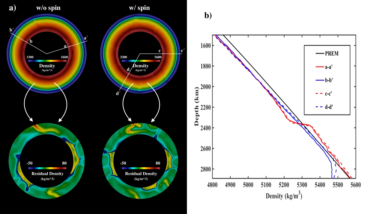 在地幔内部,随着温度和压力的增加,矿物结构会发生改变,从而使其物理性质发生变化,这种变化会影响到地幔内部的动力学演化过程。近年来,矿物物理学研究发现在中-深部地幔,铁方镁石可以从高自旋状态逐渐转换成低自旋状态,密度及其他相关物理性质也会随之改变(图1),但受限于高温压条件及实验观测时间,目前对这种自旋状态变化所引起的全地幔动力学影响研究还非常有限。